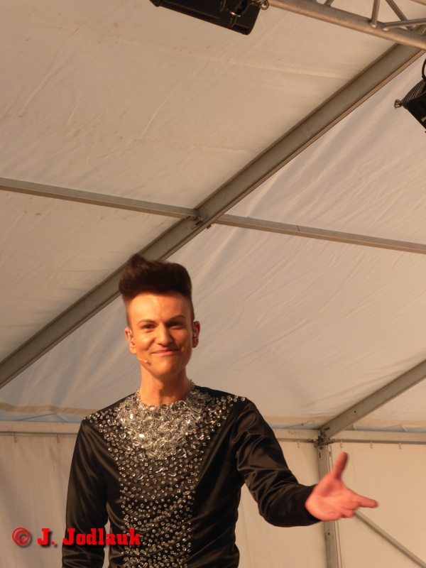 Mit etwas Verspätung begann dann das offizielle Programm, Musiker Guido Goh und Countertenor Oswald Musielski traten zu Beginn auf, bevor die Modenschau begann. Die Mode zeichnet sich durch zarte Pastelltöne, aber auch bunte oder Blumen-Muster aus, unter dem Motto „Erlaubt ist was gefällt“.